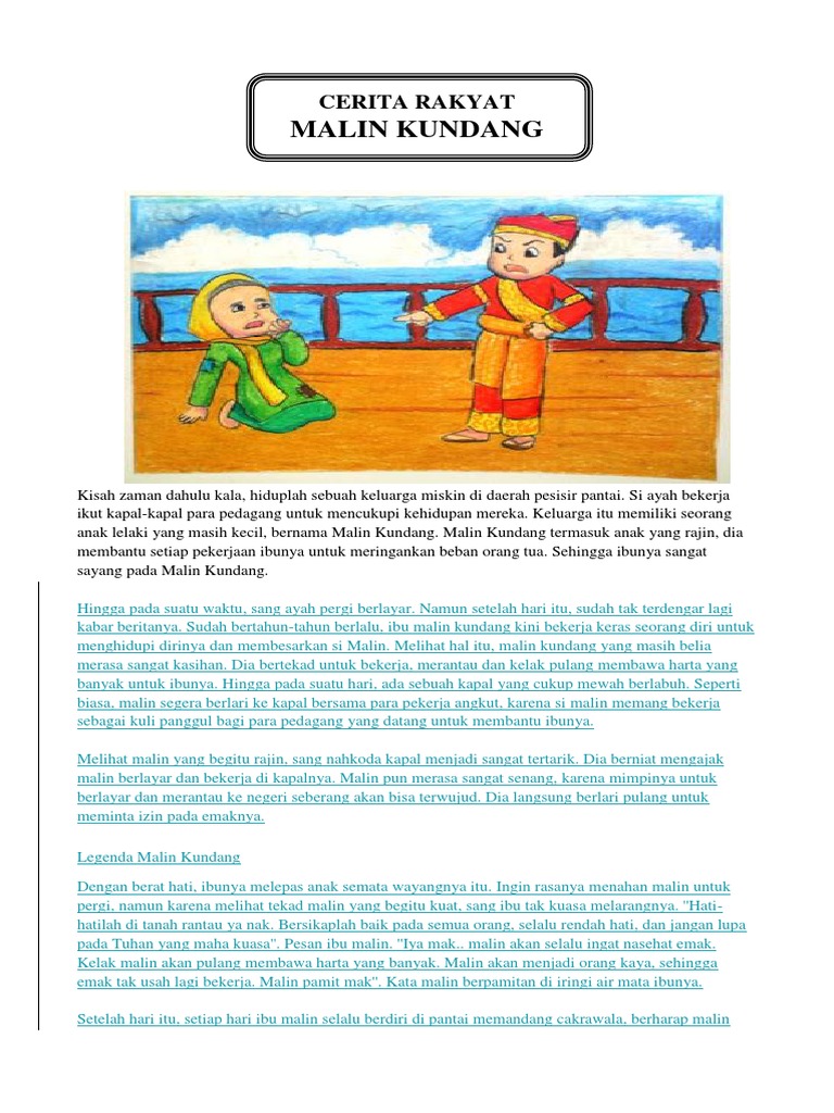 Pesan moral yang terdapat pada cerita malin kundang ini : 7 malin kundang durkaha kepada ibunya. Cerita malin kundang singkat adalah ringkasan dari cerita rakyat malin kundang yang pernah kami posting di blog ini sebelumnya. Materi makalah cerita rakyat, cerita rakyat malin kundang, lutung kasarung, legenda panjang, pengertian, jenis, ciri, unsur dan contohnya kemudian, malin kundang pergi ke tanah rantau meninggalkan sang ibu seorang diri. Malin kundang, anak yatim yang meninggalkan ibunya untuk merantau. Legenda malin kundang dalam bahasa inggris. Dia menikah dengan seorang anak saudagar kaya dan ia. Alkisah disebuah pesisir pantai wilayah sumatera barat tinggalah keluarga kecil yang terdiri. Keesokan harinya malin kundang dan rasyid bertolak menuju negeri seberang dengan menumpang kapal besar bermuatan barang dagangan, ibu malin hanya bisa. Cerita sejarah maling kundang singkat pendek. Cerita malin kundang selalu digunakan untuk pengingat anak kala tidak menurut kepada orang tuanya. Singkat cerita, ibu malin pun mengutuk malin menjadi batu. Pesan yang bisa disampaikan ke anak dari kisah ini adalah sayangilah orangtua ketika gembira atau sedih.